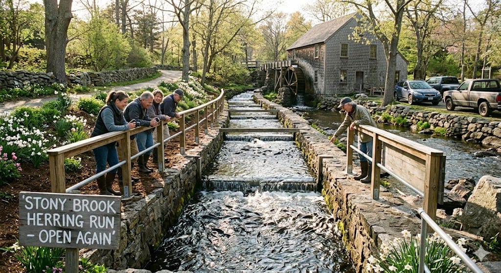 That makes this spring feel a little more like the Brewster spring people actually know. You head down Stony Brook Road, slow down almost without meaning to, and there it is again: silver movement in the water, people leaning in for a better look, that annual sign that winter is done and the season has turned. It is one of those places that lives quietly in local muscle memory until the run starts and everyone remembers how much they missed it.