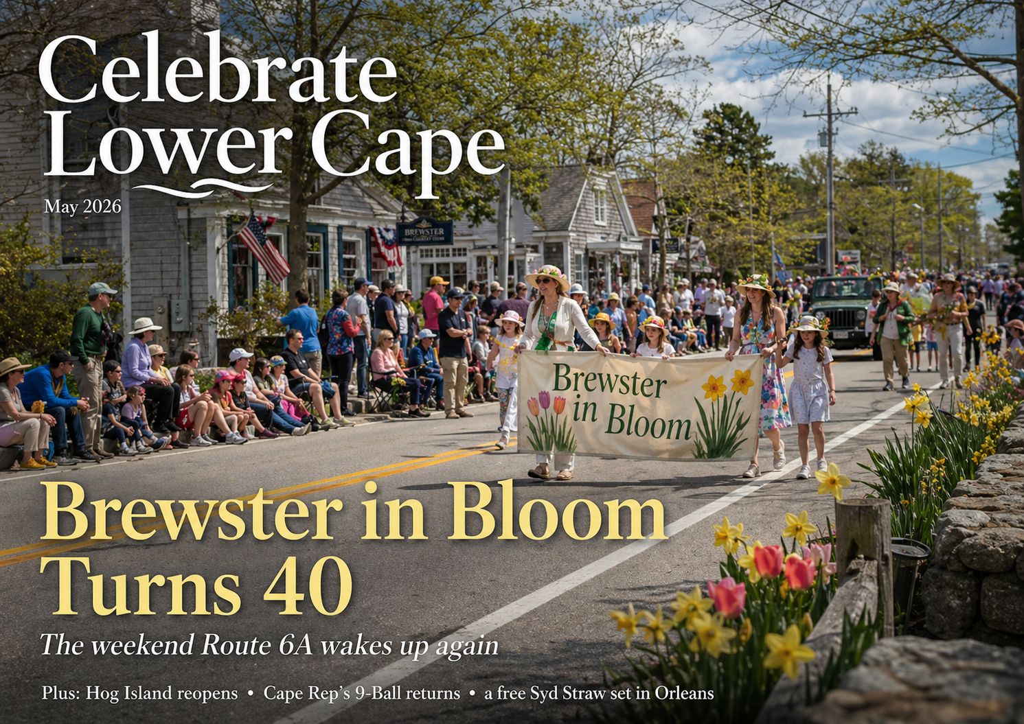 Route 6A gets its first real traffic of the season. Brewster in Bloom turns 40 this weekend — the parade, the craft show, the 5K, the open houses — and all of it happens at once on Saturday.