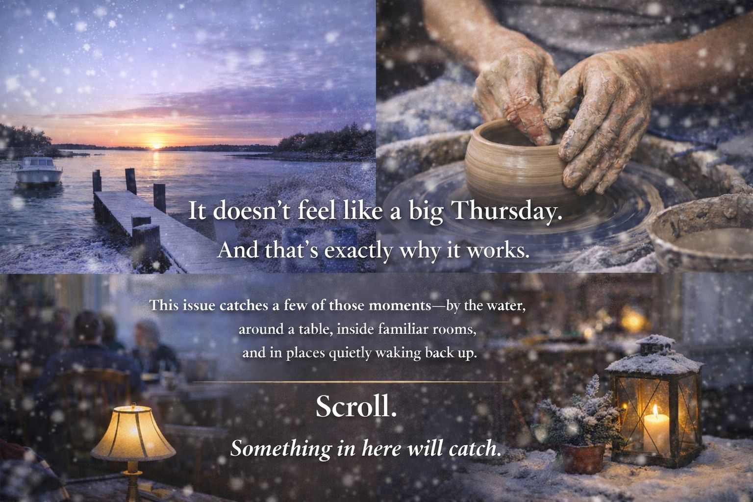 Arts & Culture this week isn’t passive. It’s participatory. You listen closely, you make something, you stay longer than planned. From winter ritual at the meetinghouse to studios that are already humming by mid-morning, this is the stretch of the calendar that rewards attention.